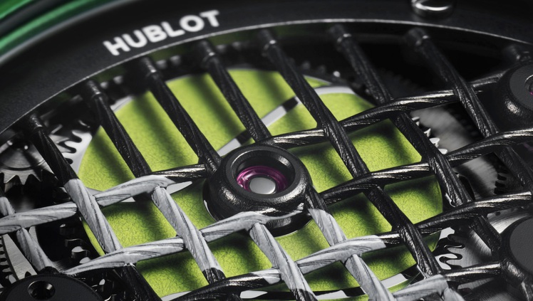 Under the Gorilla Glass crystal, Hublot’s MHUB6035 self-winding tourbillon powers all three versions of the collection, boasting a tourbillon at 6 o’clock, a micro-rotor at 12 o’clock, and sapphire plates for floating indices. With a total of 293 components, it also offers 72 hours of reserve thanks to a barrel that’s styled like a tennis ball.