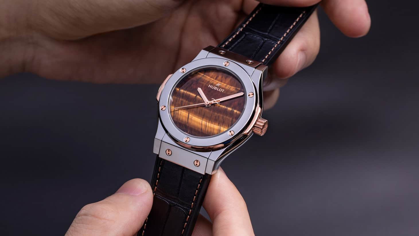 In a showing of restraint, Hublot and The Hour Glass are limiting each dial variation to just 10 pieces, which combined with the unique pattern found in each dial, makes them all the more exclusive. While tigerโs eye, malachite, and lapis lazuli are not unusual to find as dial materials in watchmaking, the inclusion of a red jasper dial is genuinely rare and showcases Hublotโs expertise in stone and gem cutting. None of the dials is cluttered with hour markers or unnecessary text, which sees the King Gold hands cut a striking figure across their surface and celebrates the intricacies of their patterns all the more.
