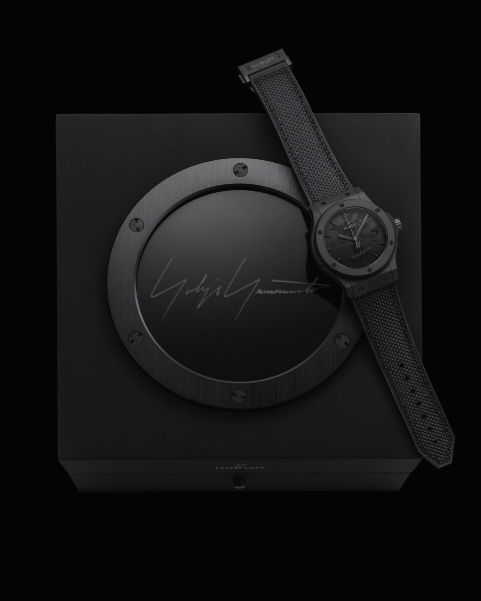 Both Hublot and Yamamoto are known for their provocative approach to their respective industries, bordering on the anti-orthodox, and use the colour black as a minimalist assertion instead of an absence of colour.