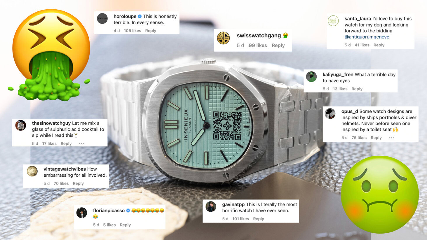 As you would hope, the Tiffany-blue-NFT-Nautilus-Royal-Oak was laid on the barbeque of Instagram comments and set to burnt-to-a-fucking-crisp, with hundreds of commenters torching the horrifying horological creation. Beyond the fact that the quality of the watch was very visibly lacking, with multiple hour markers doing their best โleaning tower of Pisaโ impression, the post also saw the designer of the watch, Marco Mavilla, attempt to defend the design while admitting โGenius Genta was a mistake (not mine) thatโs why I created IngenieuxWatches.โ