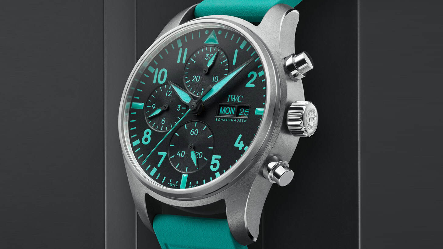 This year, the IWC F1 Pilot’s Watch (the eye-wateringly long full name of which is IWC Pilot’s Watch Chronograph 41 Edition “Mercedes-AMG Petronas F1 Team”) uses a similar template to that of 2021, but is specific to the Mercedes-AMG Petronas Formula One Team, right down to its cyan highlights. A lick of blue/green might not sound like much, but it really works visually, and when you consider the timing of the launch with the Miami GP, the colour can’t help but remind you of Don Johnson’s shirts in Miami Vice.