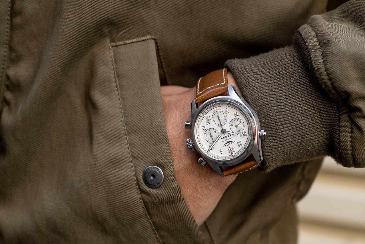 The restrained steel case utilises brushed and polished finishes to highlight the bezel and distinct chamfers that extend, uninterrupted, from lug to lug. From above, the watch looks slightly elongated due to the length of the lugs, which curve nicely over the wrist. Despite the link to aviation โ with an oversized crown for adjusting the time while wearing gloves โ thereโs a military aesthetic and utilitarian approach to the design.