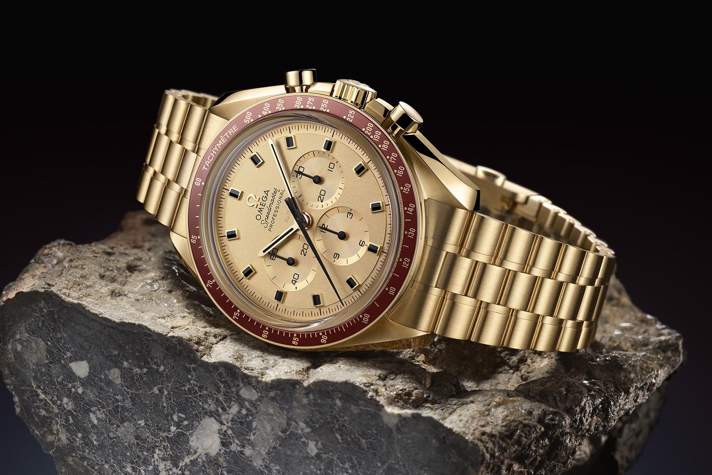This modern release is aesthetically very similar to its forebearer โ a width of 42mm, golden case and face, burgundy bezel, and black-onyx markers. But this is where the similarities cease. Replacing the original models 18k yellow gold is a tone that Omega has aptly named โMoonshine Goldโ, which utilises mixes of palladium to battle the colour degeneration standard gold releases are prone to.