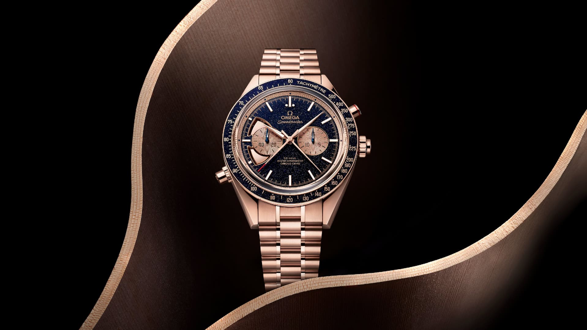 The dial is where we get our first true sense that the Omega Speedmaster Chrono Chime is a different beast when compared to your standard Moonwatch, with just two chronograph registers and a pair of chiming gongs nestled around the register at nine oโclock. Both the subdials and the ring around the minute track have been expertly finished with engravings inspired by soundwaves, while the darkened dial and bezel are made from blue aventurine โGrand Feuโ enamel.