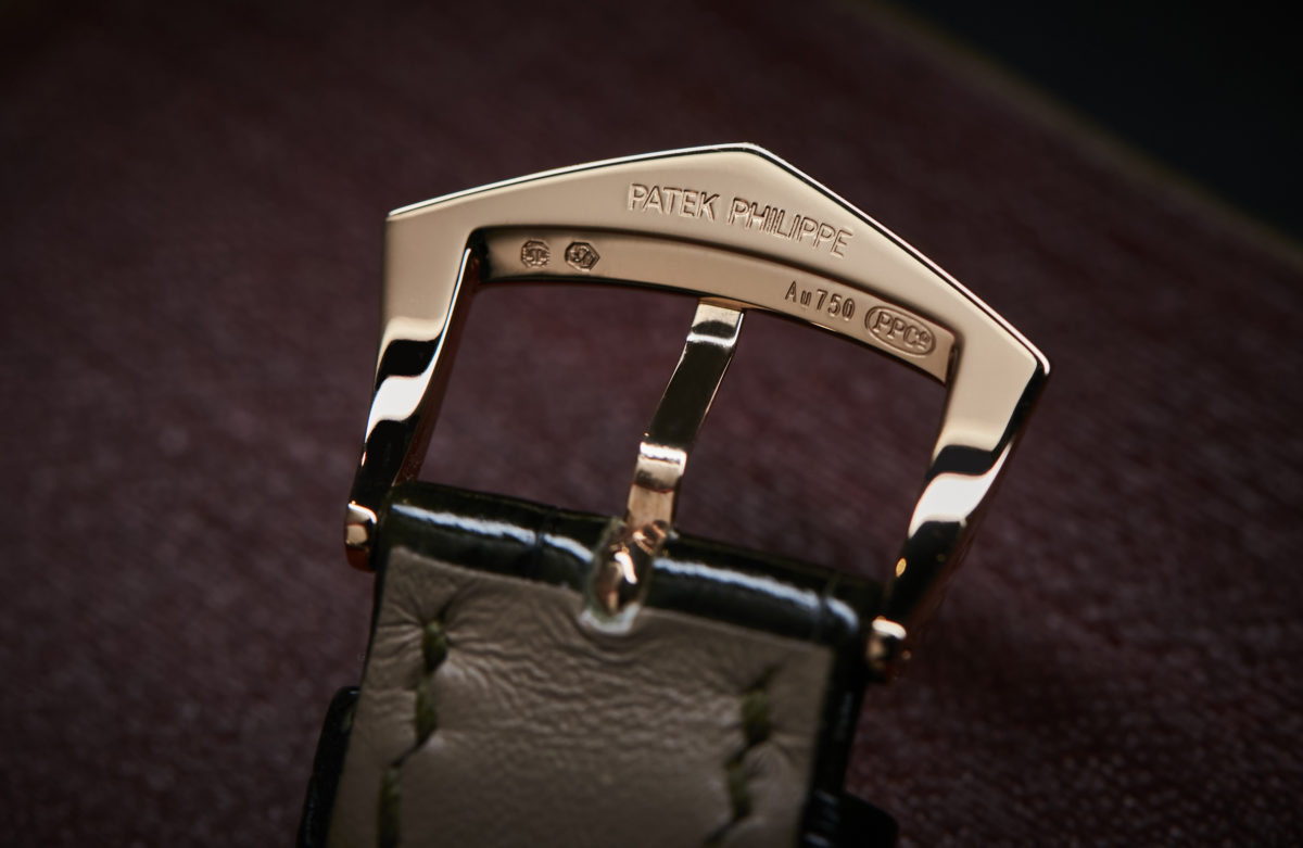 As you’d expect from Patek Philippe, the quality of their straps is also extremely high, with this 5205R arriving on a green handstitched alligator leather strap that matches the dial. It’s secured with a spade-shaped rose gold pin buckle that works well with the watch.