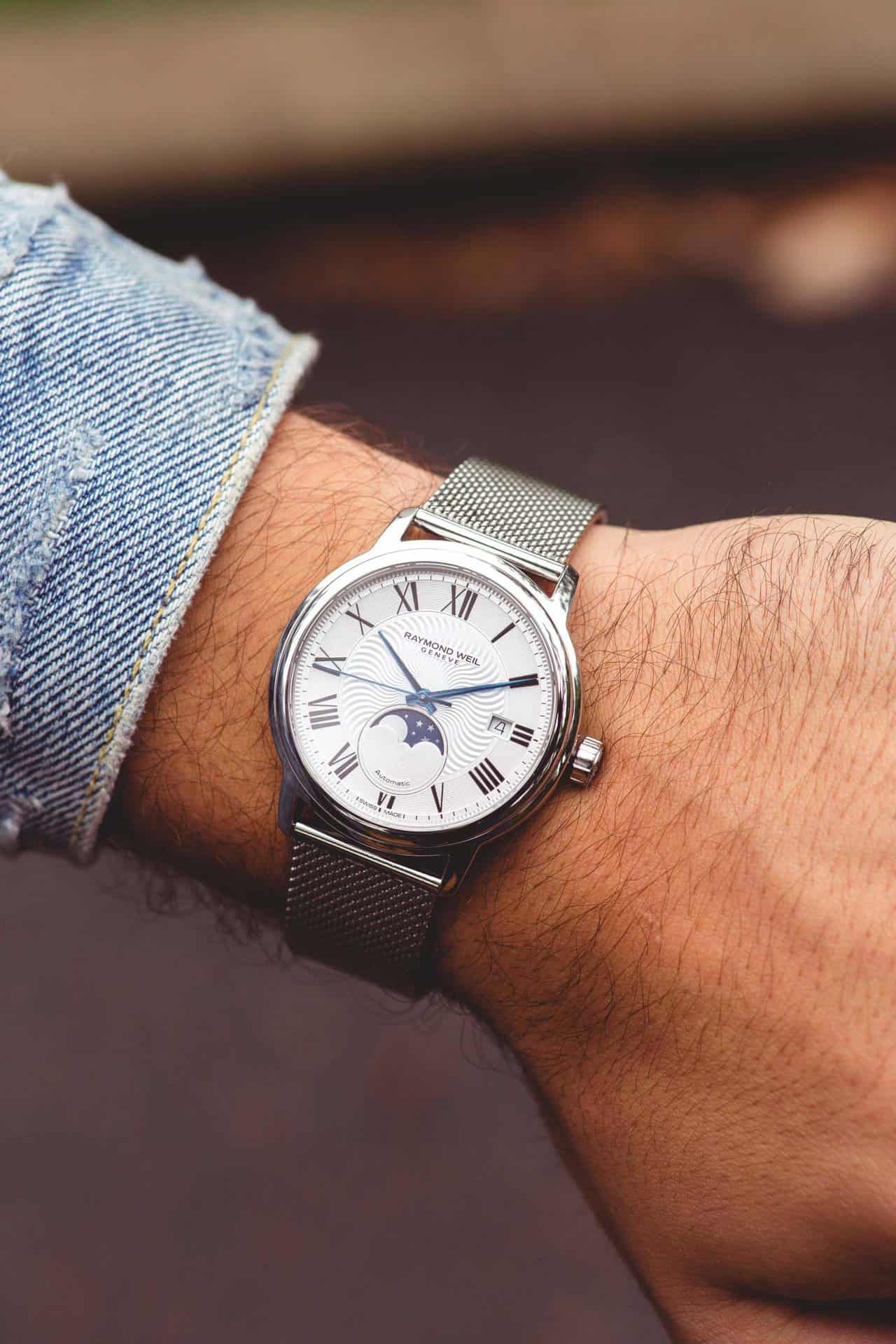 Check out the Raymond Weil Maestro Moon Phase here. You can also add in one of their iconic Parsifal collection into the mix.