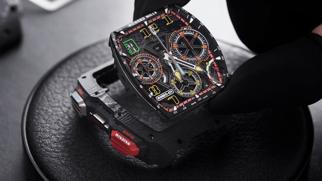 With a signature Carbon TPT case measuring to 44mm by 49.9mm, the RM 65-01 features pushers at two oโclock (start/stop), four oโclock (reset), eight oโclock (first in-house rapid winding mechanism), and ten oโclock (split-seconds function, AKA rattrapante). In the 3 oโclock position, youโll find quite a unique titanium crown which can adjust its various settings without having to be pulled out โ traditional hand-winding, date adjustment, and time adjustment.
