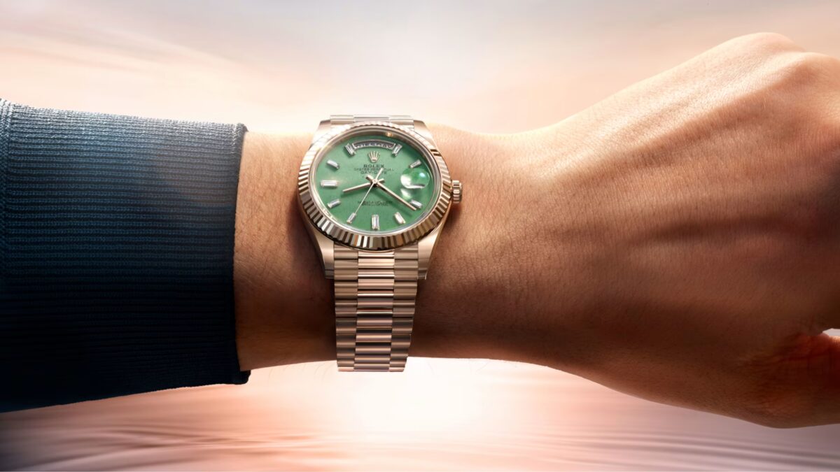 The Day-Date 40 in Jubilee Gold, the brand’s new alloy described as carrying tones of yellow, warm grey and soft pink, pairs with an Aventurine dial in a way that will make sense to auction houses in 2046.