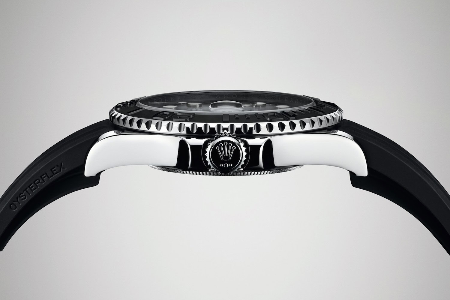 Finished in 18-karat white gold with a matte black Cerachrome bezel set against a black dial, the new Yacht-Master is paired with an Oysterflex bracelet to match.