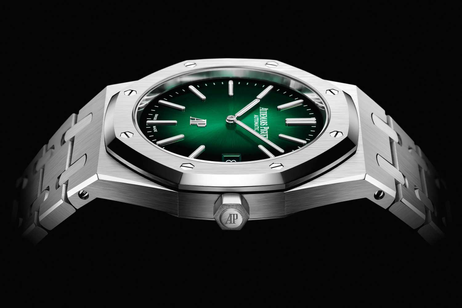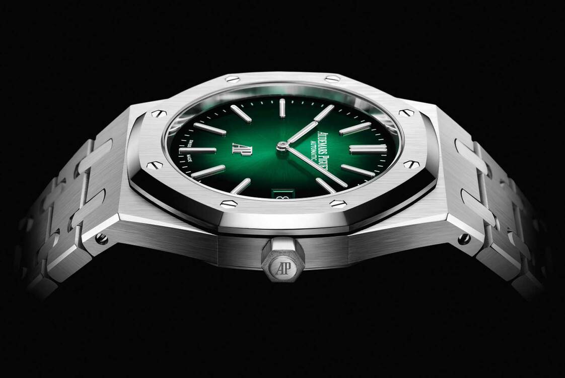 The Royal Oak Jumbo Extra-Thin in sunburst green has a 40-hour power reserve and is rated for water resistance of up to 50 metres.