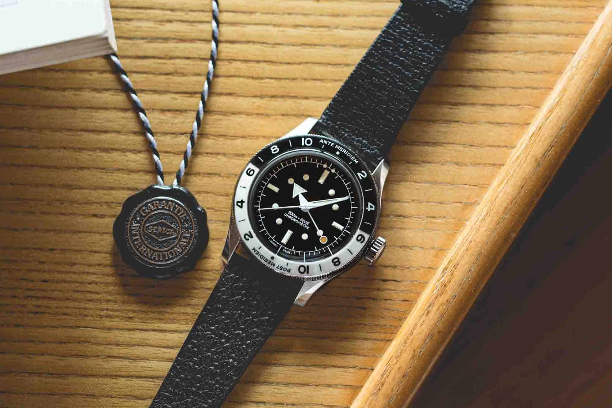 As with all Serica watches, the dial is a study in sparseness, featuring very minimal text to allow it to do its job of clearly communicating the time, with an arrow-shaped hour hand and distinct brown lollipop GMT hand. The bezel is perhaps where Serica offers its strongest statement of difference, executed in contrasting asymmetric black and white ceramic with ante meridiem and post meridiem text to communicate the “transition between day and night is progressive and never happens twice at the same time.”