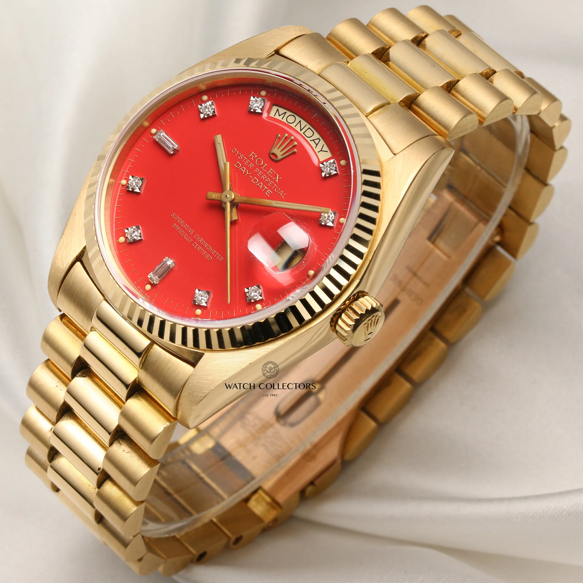 The most similar watch you can actually buy is a Rolex Day-Date โRed Stellaโ dial ref. 18038, which was recently sold by the UK-based dealer Watch Collectors (linked below).