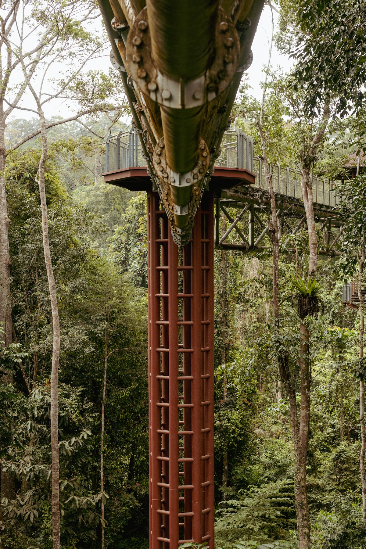 Fifteen minutes later, we arrive at a treetop walk, a maze of towering iron-and-steel structures that look eerily dystopian. Way up in the canopy, a vibrant, almost fluorescent rainbow snakeslithers directly between our feet, then launches itself off the grate into midair. “A paradise flying snake,” says Sam, visibly impressed. He’s never encountered one of those before.