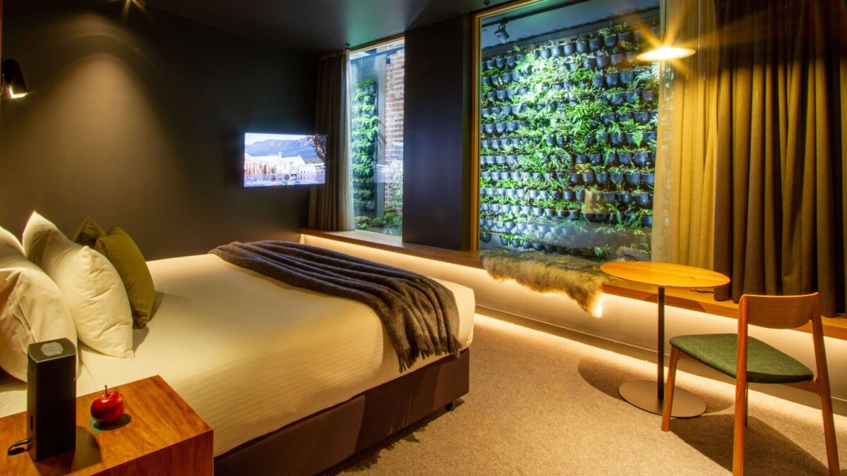 Many of Tassie’s top stays are a result of immaculate restoration projects, given the state is absolutely heaving with unique heritage buildings. Hobart is the centre of this renaissance, and The Moss Hotel is a perfect example, transforming an early 19th century sandstone building in Salamanca into a charming boutique hotel that plays smart with lighting, texture, and greenery.