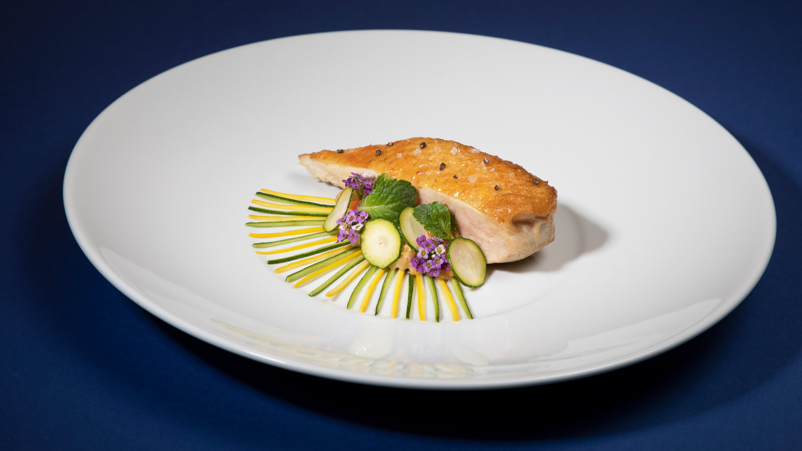 - Chicken supreme with olives and black truffles, poivrade artichokes and macaroni gratin;