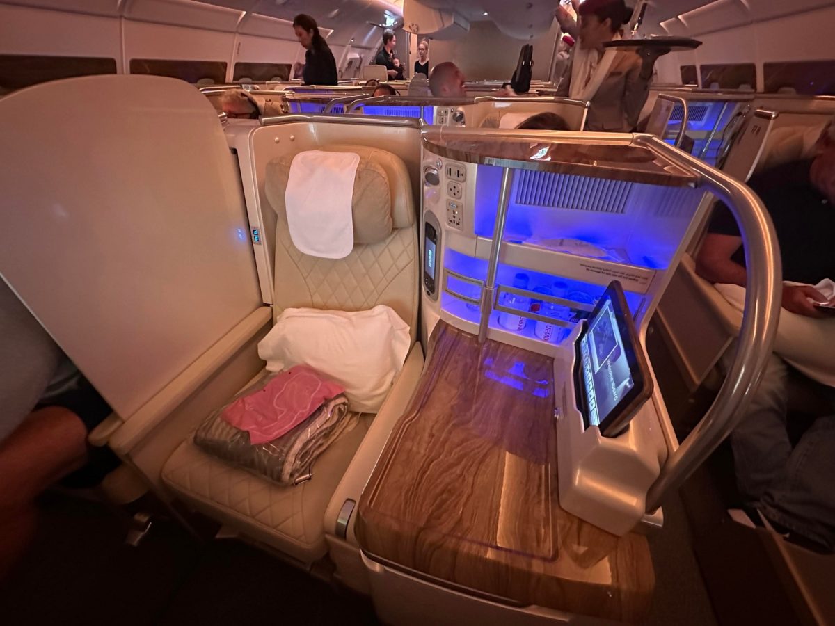 I recently flew Emirates A380 Business Class from Sydney to Dubai on flight EK413, which is serviced by the Airbus A380-800. Having had a busy week, I hadn’t thought about selecting my seat until a day before the flight, so I landed on 15D, which is part of the “2” in the 1-2-1 layout.