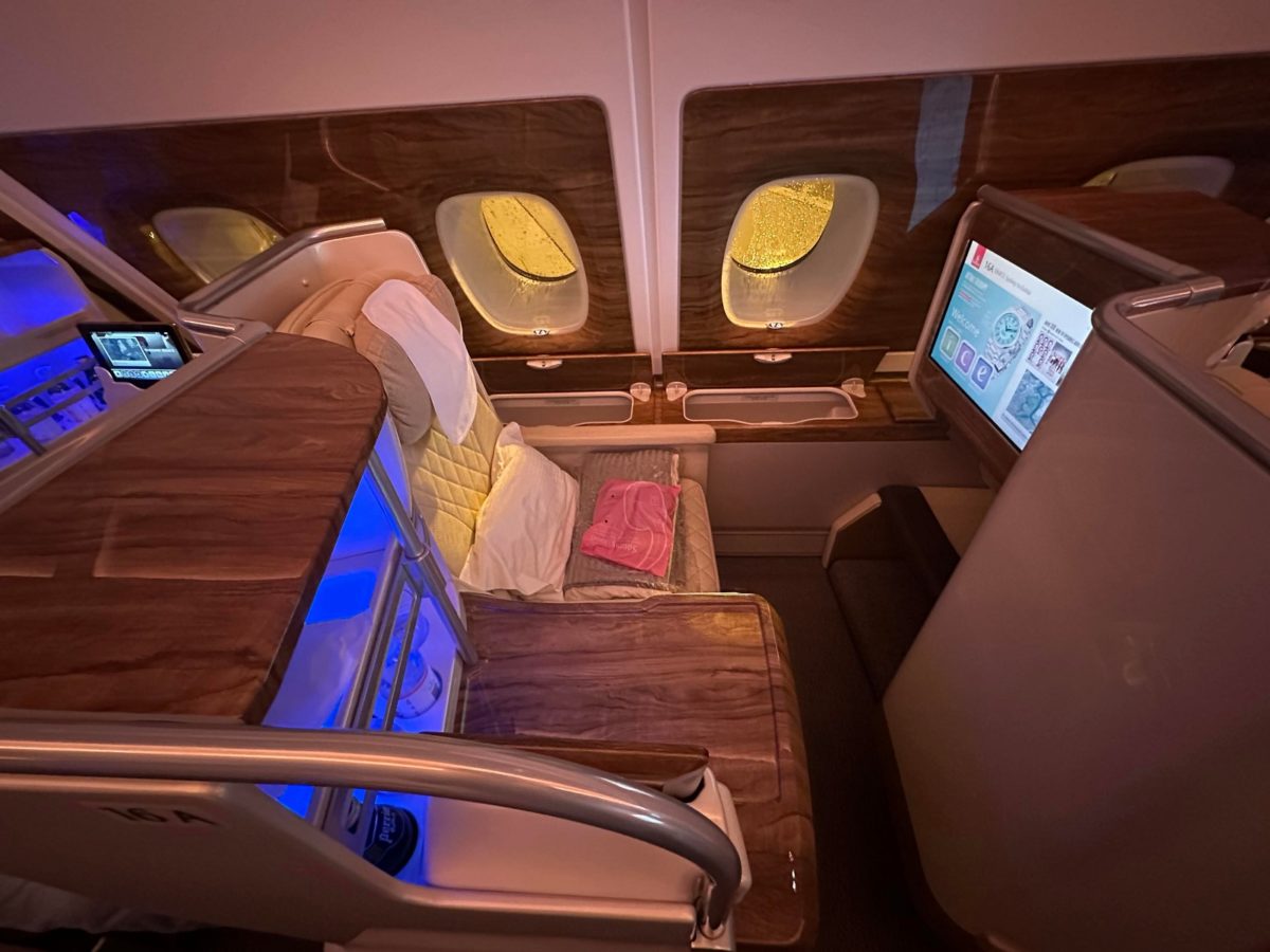 If you’re planning on being awake for the most of the flight and sleeping isn’t a concern, then I suggest going for the mini-cabin. That is, from rows 22 to 26. You’ll be closer to the four toilets as well as the widely praised Emirates A380 Bar.