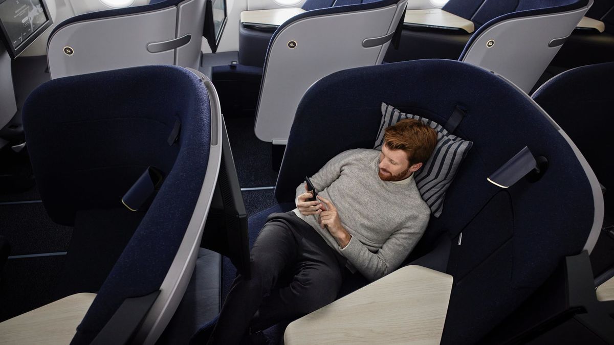 Those business class seats are most unusual. Conceived as the AirLounge from highly regarded seat manufacturer Collins Aerospace, each features a sofa-inspired fixed shell design that does not recline and takes inspiration from residential furniture, as opposed to conventional aircraft seats.