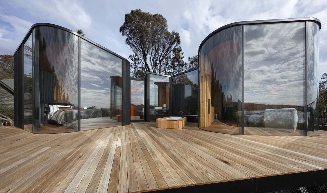 Tasmanian-based Liminal Architecture took their inspiration for the smooth and rounded forms of the pavilions from the coastal granite rock formations found at adjacent Honeymoon Bay. Each of the nine dwellings share the same layout, albeit some with better bay views than others.