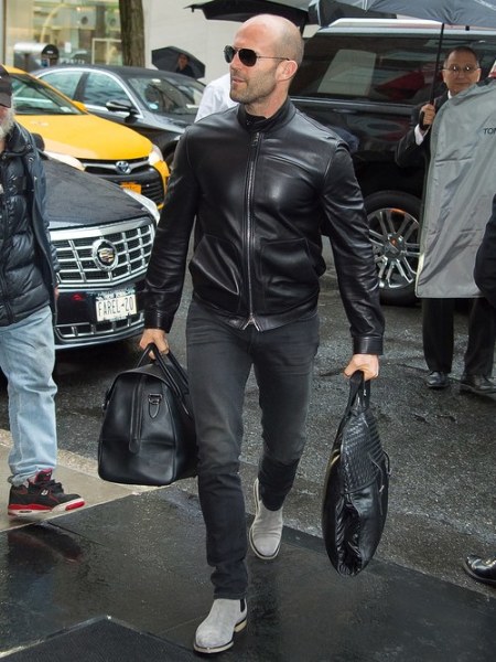 British Don Jason Statham has once again proven to us why he can do no wrong with this killer get-up he was spotted wearing in New York City last week. The monotone black leather jacket, fitted charcoal jeans and grey suede Chelsea boot combination can be championed by pretty much any bloke, during any season and in any setting.