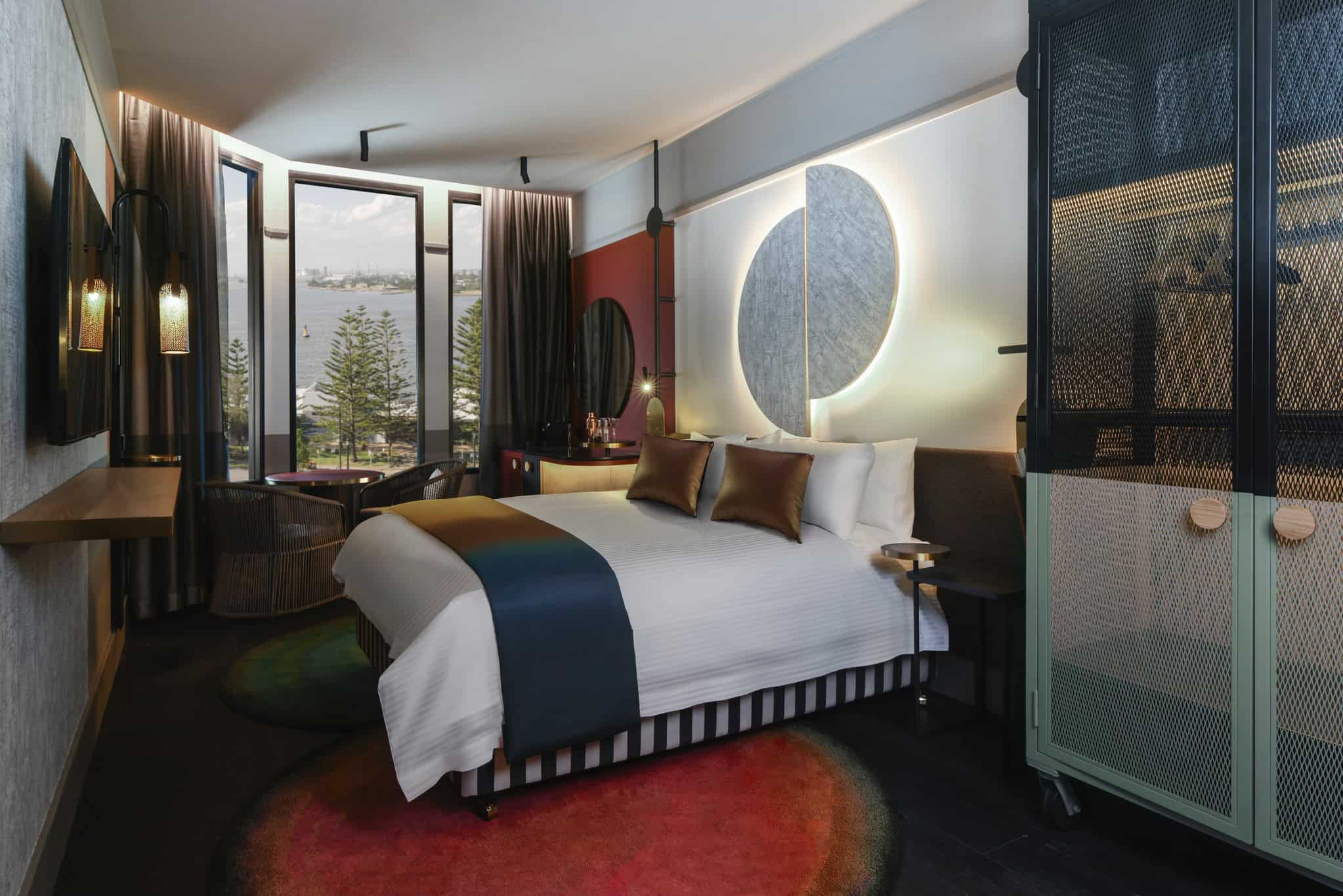 The buildingโs mammoth floor-to-ceiling heritage windows have been revived to pull the cityโs best angles into the hotelโs all-encompassing vista, taking in the surrounding landmarks like Newcastle Harbour and Christ Church Cathedral and setting that against a multi-hued palette that makes use of colour blocking and juxtaposing textures.