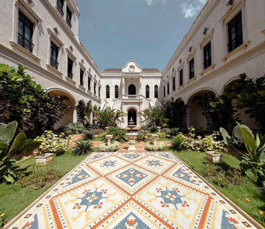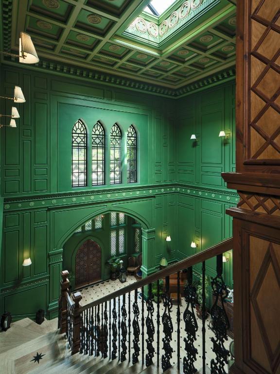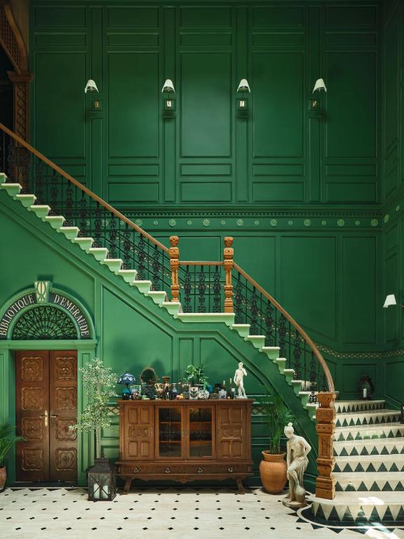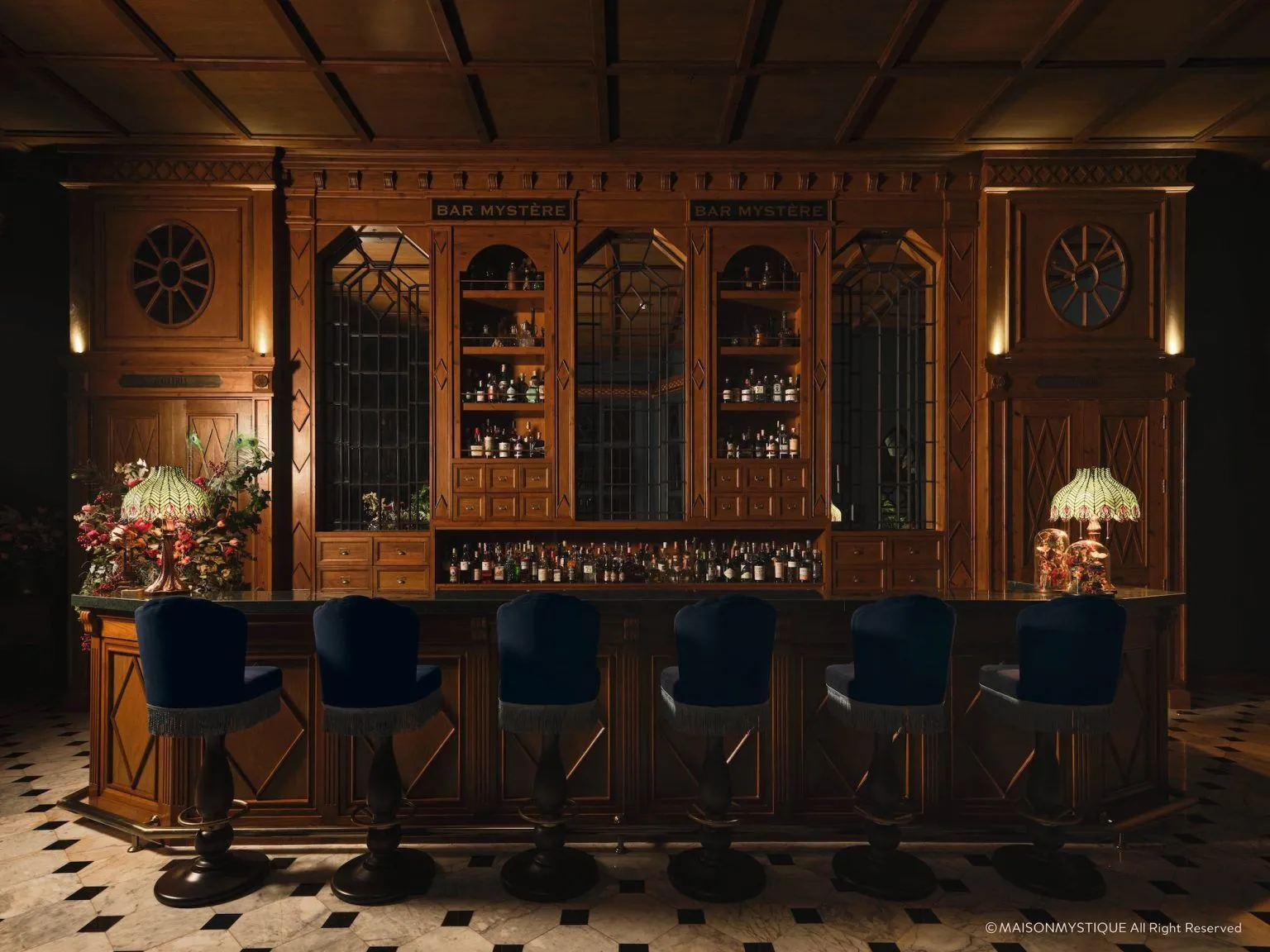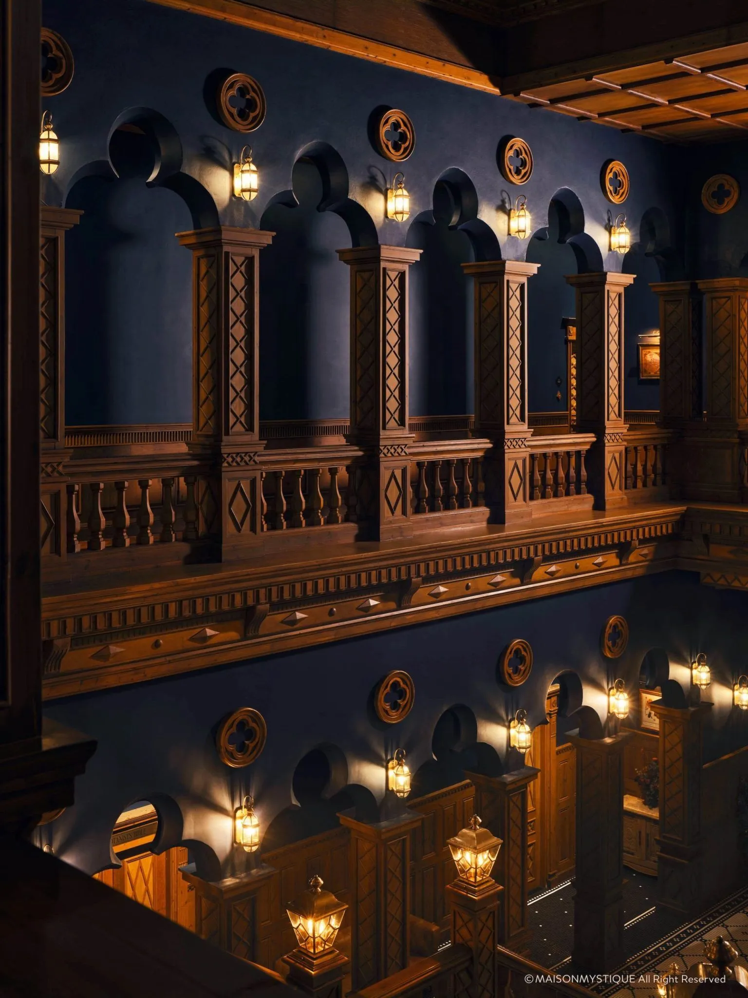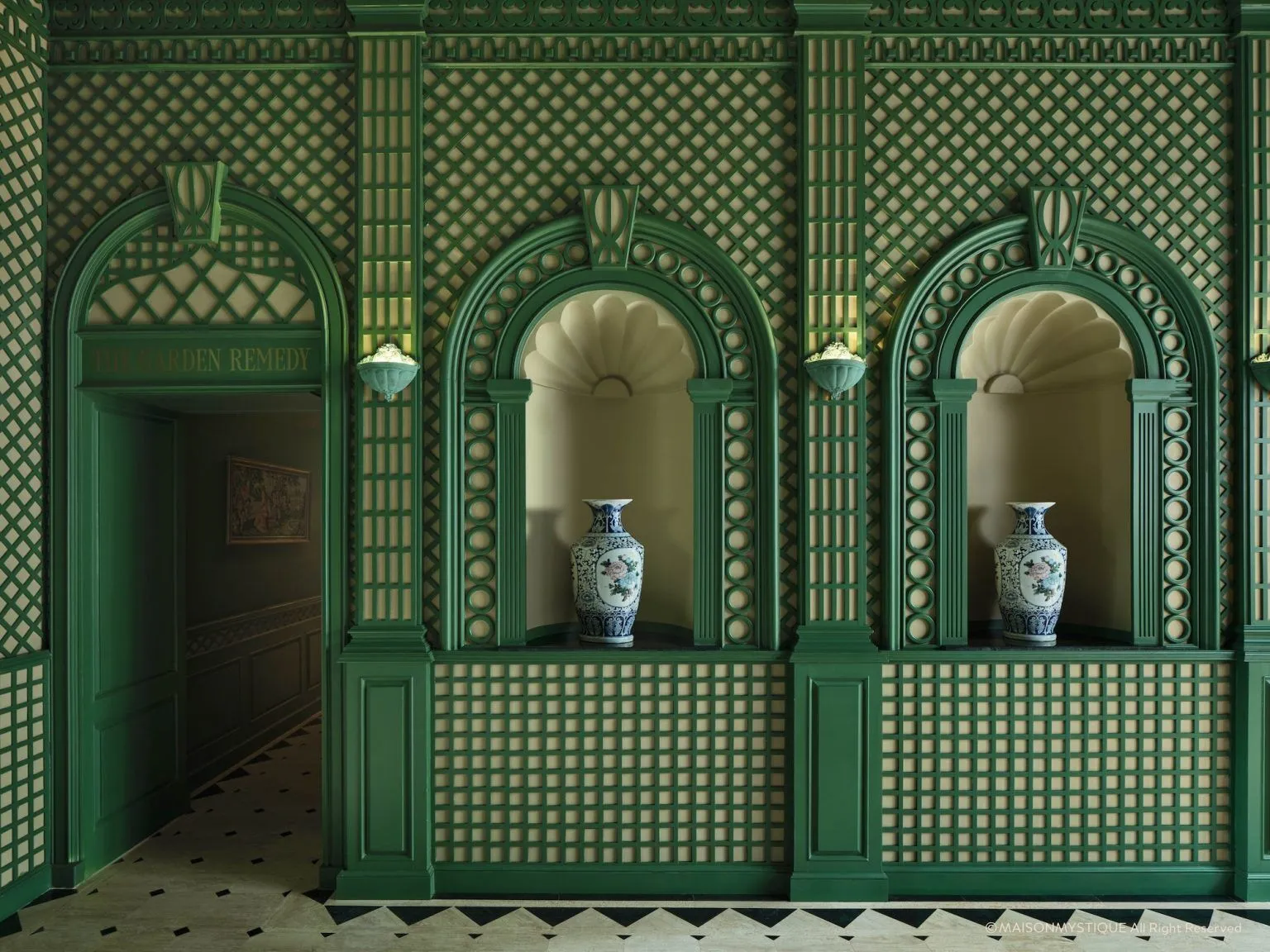 The Hall of Mystery, Maison Mystique’s beating heart, spirals upwards with its emerald marble staircase framed by carved rosettes and atmospheric indigo walls. Nearby, the Garden Hall blooms in pale botanical tones – a space inspired by European orangeries, all trellised walls and fern-laden corners.