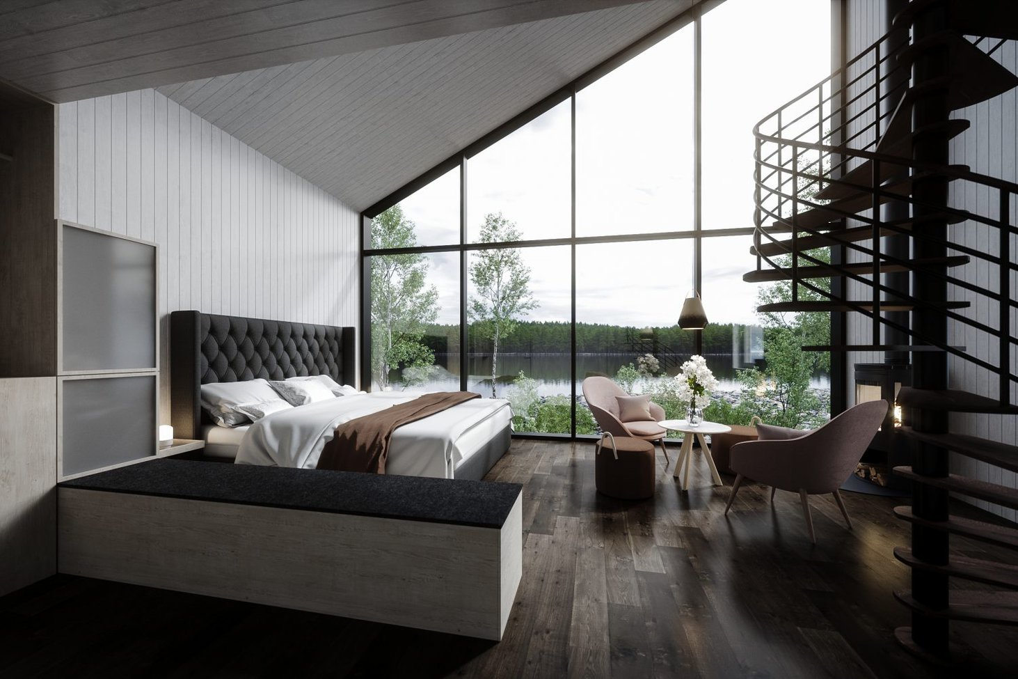 Thereโs also an additional six cabins on the shore. Designed by AnnKathrin Lundqvist, these cabins feature floor-to-ceiling windows looking out over the Lule River (below).