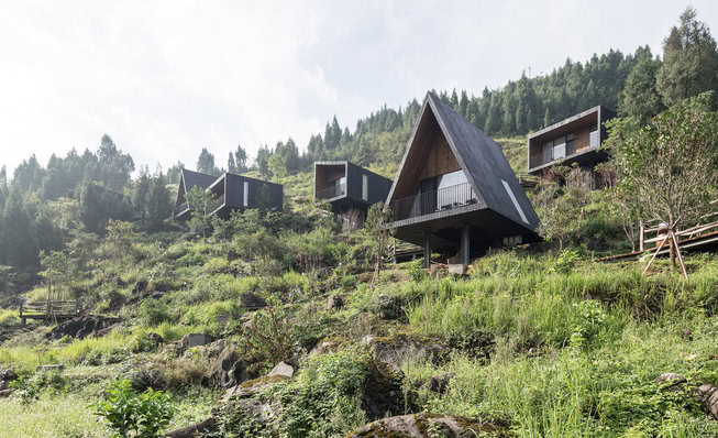 Made up of 10 single-story wooden houses, the hotel is built into the side of a mountain and surrounded by so much lush greenery you wonโt know where to look. The 10 cabins come in three different shapes: a rectangle, triangle, and trapezoid.